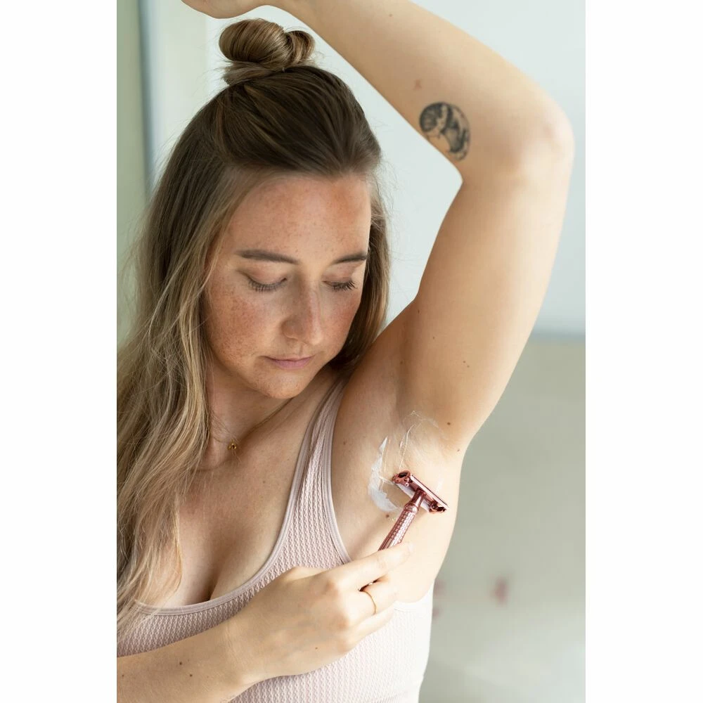Wilkinson Woman Intuition Safety Razor Rose GoldWilkinson Intuition Safety Razor Rose Gold met het klassieke scheermesje waarmee je aan beide kanten kan scheren. Het scheermesje heeft een driedubbele coating wat zorgt voor een ongelooflijk glad en zacht scheerresultaat. De plasticvrije, hoogwaardige metalen handgreep glijdt dankzij zijn eigen gewicht soepel en zonder druk over de huid. Met een vlinderopening voor eenvoudig verwijderen en plaatsen van het navulmesje – ontworpen voor eenvoudig en